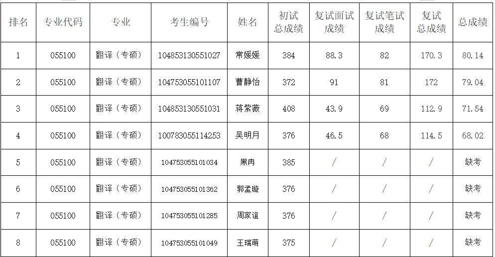 按照公司招生工作安排,365在线体育投注官网2023年硕士研究生复试工作(翻译调剂)于4月10日进行,现将公司研究生考试翻译调剂复试成绩情况公示如下: