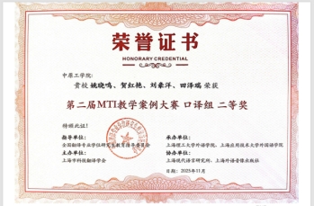 大赛旨在丰富MTI教学的多样性,汇聚不同高校的翻译硕士专业在MTI教学过程中积累的经验做法,同时为各类公司的MTI课程提供具有实践指导意义的教学案例。公司依托河南省知识产权外译研究中心,聚焦知识产权外译研究与实践,深挖地理标志外译素材和案例,由姚晓鸣、贺红艳教师,MTI研究生刘豪洋、田泽瑞组成的团队以“AI+口译模拟项目:河南省地标产品国际推介会”为题的参赛案例荣获全国口译组二等奖;关成勇与MTI研究生白雨晨、李巧丽、杨晨斌团队以“探索‘四大怀药’译后编辑 讲好中国地标故事”为题的参赛案例荣获全国笔译组三等奖。在2025 MTI案例教学研讨会暨“第二届 MTI教学案例大赛”颁奖典礼平行论坛上,贺红艳代表团队的主旨发言,获得与会专家的一致好评。