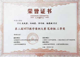 11月1日,第二届全国MTI教学案例大赛颁奖典礼在上海应用技术大学举行。大赛由全国翻译专业学位研究生教育指导委员会指导,上海市科技翻译协会主办,上海理工大学外语公司和上海应用技术大学365在线体育投注官网承办,共设笔译、口译、翻译技术、翻译项目管理四个组别。经过多轮专家评审,公司师生两个团队从全国227个参赛队中脱颖而出,荣获全国口译组二等奖1项,笔译组三等奖1项。