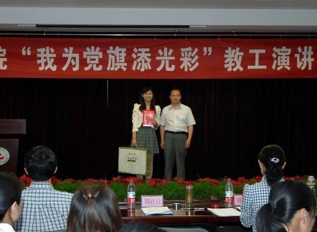 5 月 20 日 上午,公司举办“我为党旗添光彩”教工演讲比赛。公司选手张丽君老师围绕“立足本职、创先争优、追求卓越”这一公司庆祝建党90周年系列活动主题,紧扣“我为党旗添光彩”这一演讲主题,经过充分准备,满含深情地表达了对党的无比忠诚,对教育事业的无限热爱和对本职工作的深刻理解。通过她激情的演讲,最终获得本次演讲比赛的一等奖。比赛还评出二等奖3名、三等奖7名、优秀奖11名。