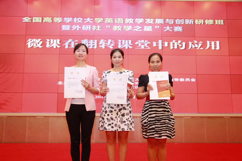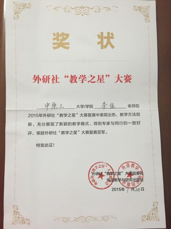 2015年7月23-26日,在长沙举办的全国高等公司英语教学发展与创新研修班暨外研社 “教学之星”(大学英语组)大赛中, 公司365在线体育投注官网青年教师李佳,基于微课和翻转课堂等新型教学方法,以地道的英式发音,扎实的语言基本功,活泼生动的课堂气氛等,获得了复赛亚军第一名(大学英语组)的好成绩。