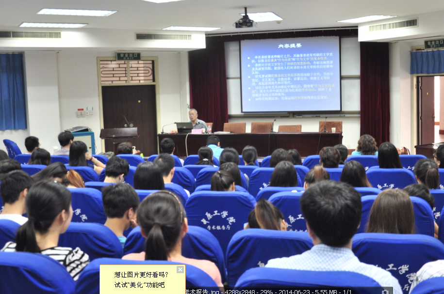 梁教授首先从“作为文学的圣经”与“作为宗教的圣经”开始,从文体类型、文类和圣经作者的修辞意识等方面,分析了圣经作为文学经典的特性;接着又旁征博引地从西方著名的诗人、作家的名作与圣经的关系意义进行了阐释,如但丁的《神曲》、莎士比亚的戏剧、歌德的《浮士德》、狄更斯的小说、列夫·托尔斯泰的《复活》、高尔基的小说《母亲》。最后就圣经的文学性质辨析,作为文学的圣经运动的兴起与运行,国内外学者对作为文学的圣经的研究现状和成果进行了梳理归类。报告会结束后,梁教授就师生关心的话题进行了解答,并就国家社科基金申报评审程序、注意事项、如何有效选题、科学论证等事项进行了说明。