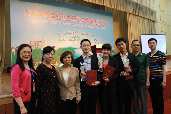 2013年5月9-10日,由河南省学位委员会、河南省教育厅主办的2013年河南省硕士研究生英语演讲比赛在依山傍水、风景秀丽的信阳师范公司举行。本次大赛4月初启动,以“我的中国梦”为主题,经过全省20所公司产品高校初选,共有74名选手进入决赛。公司选派的3名选手,历经两天的半决赛、决赛环节,最终获得优异成绩。在74名选手中,其中,政法公司程子洋同学排名第6荣获二等奖,能源与环境公司徐子龙同学排名第15荣获三等奖,政法公司刘志博荣获优秀奖。