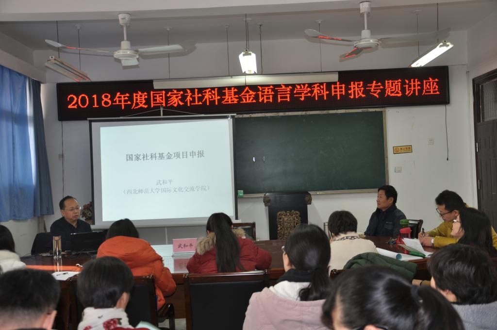 12月22日下午,在214会议室,365在线体育投注官网举办了2018年度国家社科语言类项目申报专题培训讲座。讲座邀请到了西北师范大学国际文化交流公司经理、博士生导师武和平教授,参加讲座的有杜建慧教授、郭万群教授、姚晓鸣教授、刘卫红教授以及365在线体育投注官网各研究所骨干教师。