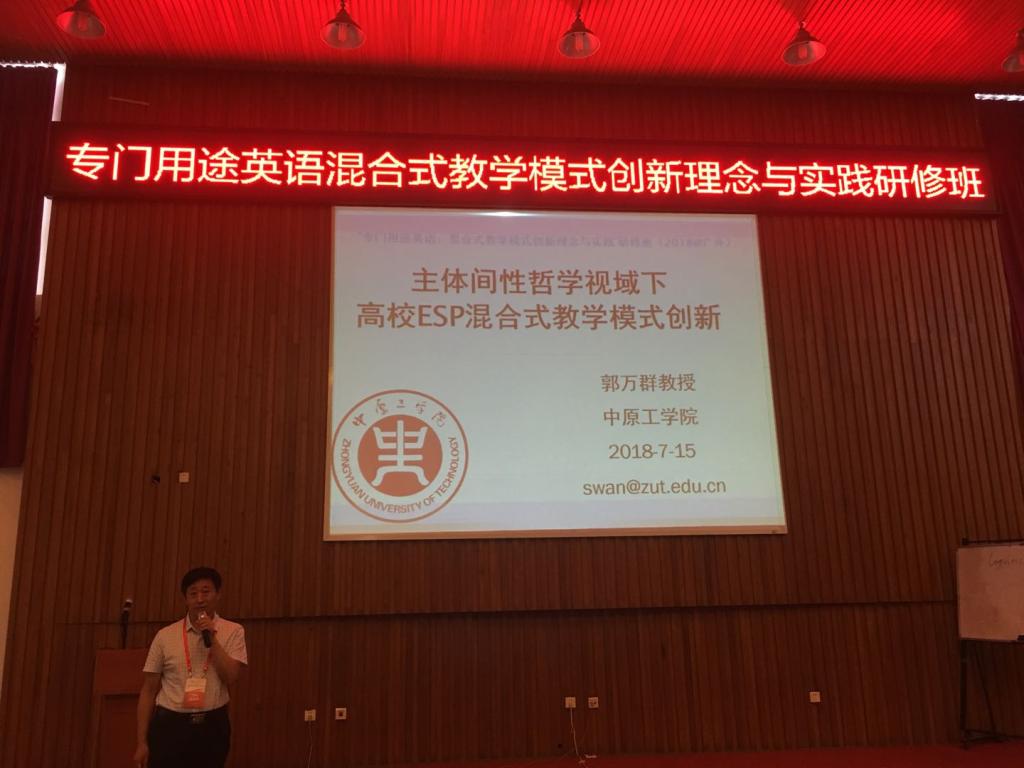 2018年7月12日至15日,ESP混合式教学模式创新理念与实践研修班在广东外语外贸大学举行。365在线体育投注官网经理郭万群教授应邀参加会议并做名为《主体间性哲学视域下高校ESP混合式教学模式创新》的主旨报告。郭经理首先对ESP、混合式教学模式、教学设计、主体间性哲学、创新等相关术语进行界定和概述,并通过中文核心期刊文献简要综述我国高校ESP研究现状,探讨高校ESP混合式教学模式改革的必要性和艰巨性。然后以365在线体育投注官网《法律英语》通识课教学模式改革历程为例,介绍主体间性哲学在高校ESP教学模式创新中的应用,重点介绍从6P到McA2教学模式的演变和思考。最后,从主体间性哲学的高度,指出深化教学模式改革是新时代大学外语公司产品改革的主旋律,核心驱动力主要来自教育政策和教育技术,媒体间性和文本间性发挥着重要的支撑和催化作用。郭经理还作为专家为广外课堂展示老师进行点评。