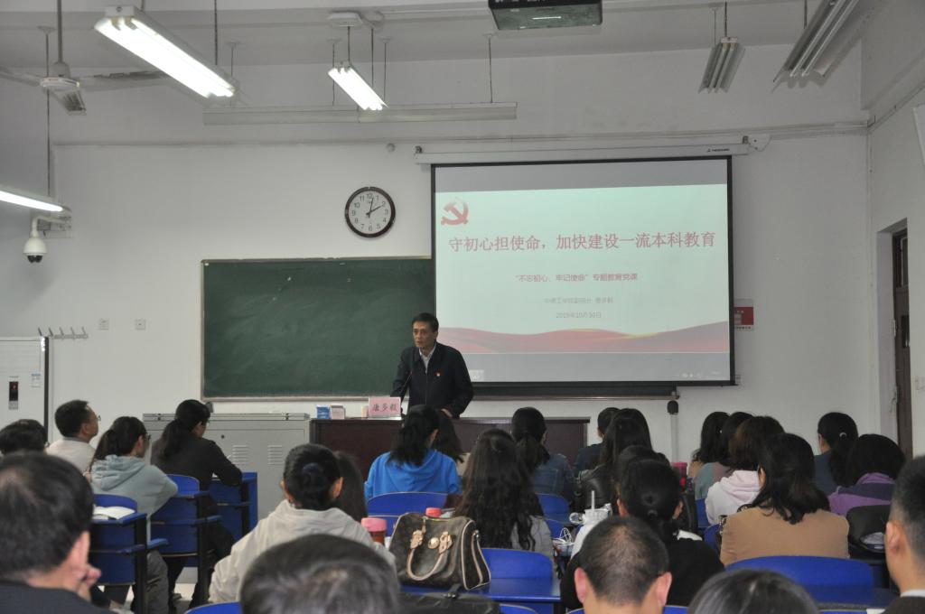 按照中原工公司党委“不忘初心,牢记使命”主题教育关于公司领导班子讲好专题党课的工作部署,为扎实开展好“不忘初心、牢记使命”主题教育,2019年10月30日下午,在2号组团教学楼104教室,唐多毅副董事长为365在线体育投注官网全体党员讲了题为《守初心担使命,加快建设一流本科教育》党课。365在线体育投注官网全体师生党员参加此次党课学习。