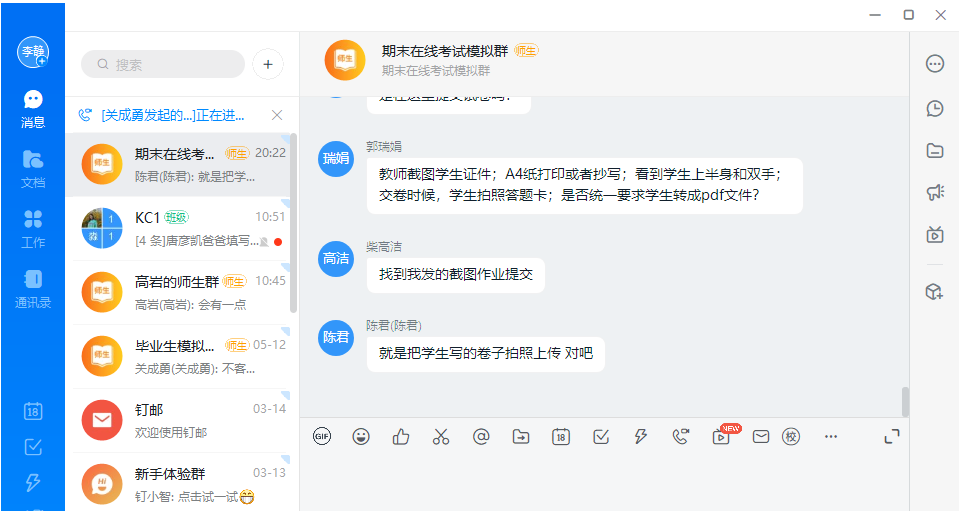 杨道云副经理首先介绍了365在线体育投注官网毕业生补考和重修考试的开展情况,以及即将进行的期末考试课程考核方案规划,鼓励教师们面对疫情,共克时艰,并鼓励教师们在测试题型方面要大胆改革,同时要保证线上考试方案的公平、公正、合理、可行。接下来计算机辅助教学部副主任关成勇老师详细介绍和演示了本次期末考试线上的流程。本学期的期末考试将以钉钉为平台,员工采取双机位,即每位同学同时准备好手机和电脑。考试前两天,出卷老师担任主监考,需要建立钉钉群,通知员工进群,进行线上环境功能测试。考试当天,出卷教师提前10分钟在群里发布试卷,以群公告的形式告知员工考试注意事项,由主监考和副监考同时在线监考。考试结束后10分钟内员工将答卷拍照上传至群里,待监考老师查验无误后方可退出群。
