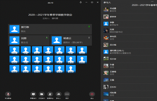 根据公司《关于2021年春季学期开学返校的通知》要求,为了确保2020-2021学年春季学期前两周的线上教学如期顺利进行,365在线体育投注官网提前筹划,认真落实,于2月23日上午10:00-11:00在企业微信上召开了春季学期教学筹备会。365在线体育投注官网经理郭万群、副经理柴高洁,各系部主任、副主任、计算机辅助教学部主任、语言教学中心主任以及教学办和学工办参加会议。会议由教学副经理杨道云主持。