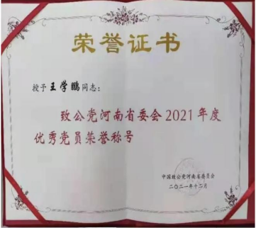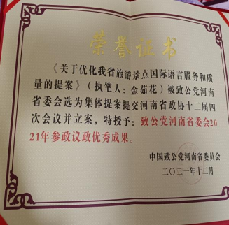 近日,中国致公党河南省委员会公布了《关于表彰2021年度社会服务工作先进集体、先进个人及参政议政优秀成果的决定》,公司王学鹏博士《关于重视与加强“黄泛区”地下水补充的提案》、金茹花博士《关于优化我省旅游景点国际语言服务和质量的提案》获得参政议政优秀成果。两项提案被致公党河南省委选为集体提案提交河南省政协十二届四次会议并立案。王学鹏被致公党河南省委授予2021年度优秀党员荣誉称号。