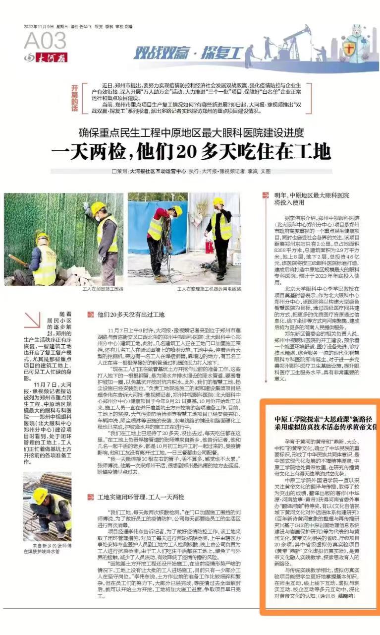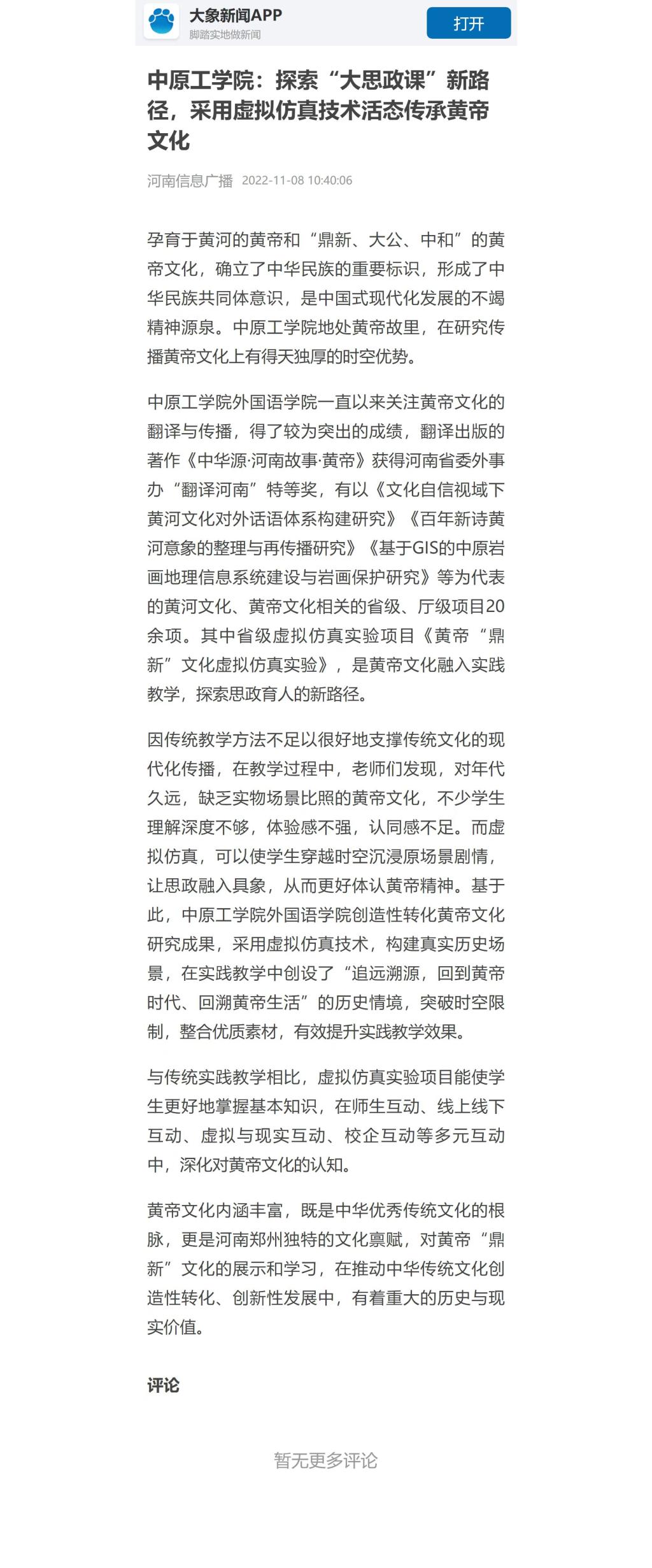 365在线体育投注官网一直以来关注黄帝文化的翻译与传播,得了较为突出的成绩,翻译出版的著作《中华源·河南故事·黄帝》获得河南省委外事办“翻译河南”特等奖,有以《文化自信视域下黄河文化对外话语体系构建研究》《百年新诗黄河意象的整理与再传播研究》《基于GIS的中原岩画地理信息系统建设与岩画保护研究》等为代表的黄河文化、黄帝文化相关的省级、厅级项目20余项。其中省级虚拟仿真实验项目《黄帝“鼎新”文化虚拟仿真实验》,是黄帝文化融入实践教学,探索思政育人的新路径。