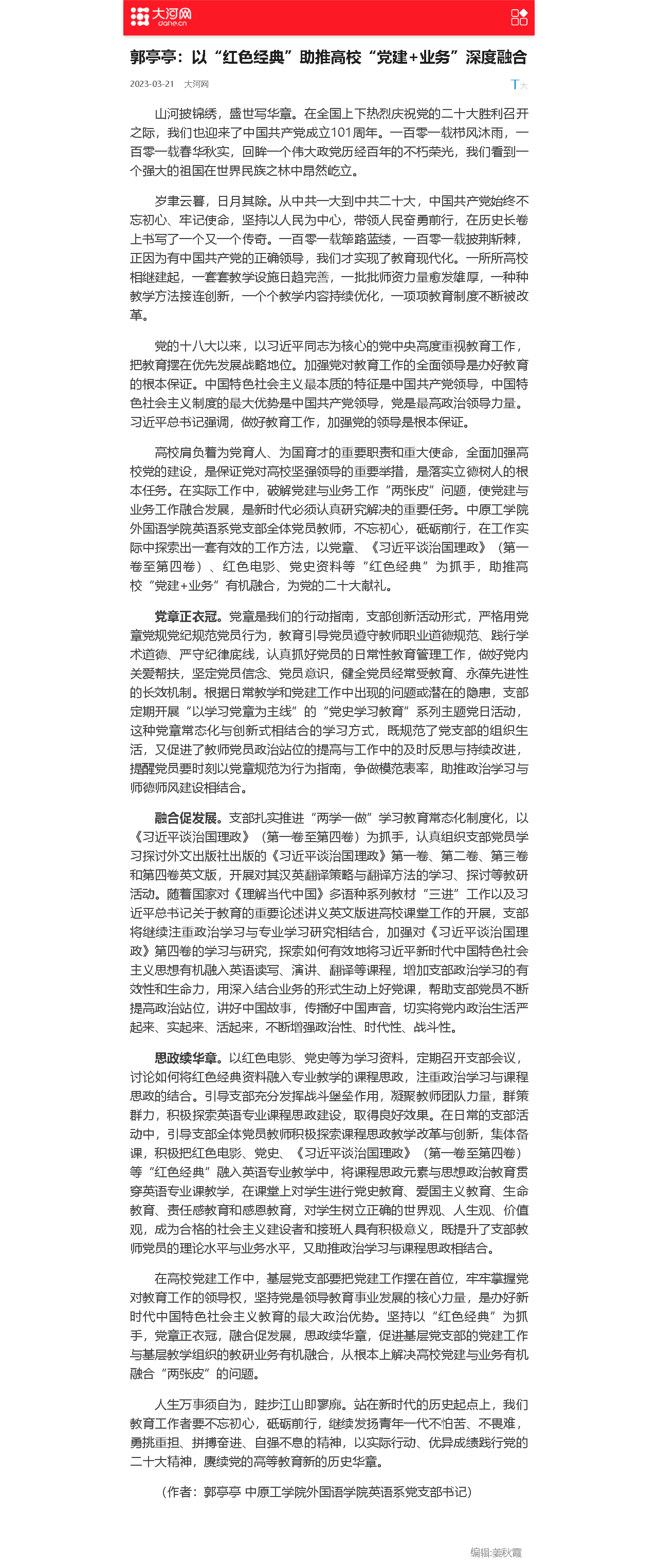 高校肩负着为党育人、为国育才的重要职责和重大使命,全面加强高公司党的建设,是保证党对高校坚强领导的重要举措,是落实立德树人的根本任务。在实际工作中,破解党建与业务工作“两张皮”问题,使党建与业务工作融合发展,是新时代必须认真研究解决的重要任务。365在线体育投注官网英语系党支部全体党员教师,不忘初心,砥砺前行,在工作实际中探索出一套有效的工作方法,以党章、《习近平谈治国理政》第一卷至第四卷、红色电影、党史资料等“红色经典”为抓手,助推高校“党建+业务”有机融合,为党的二十大献礼。