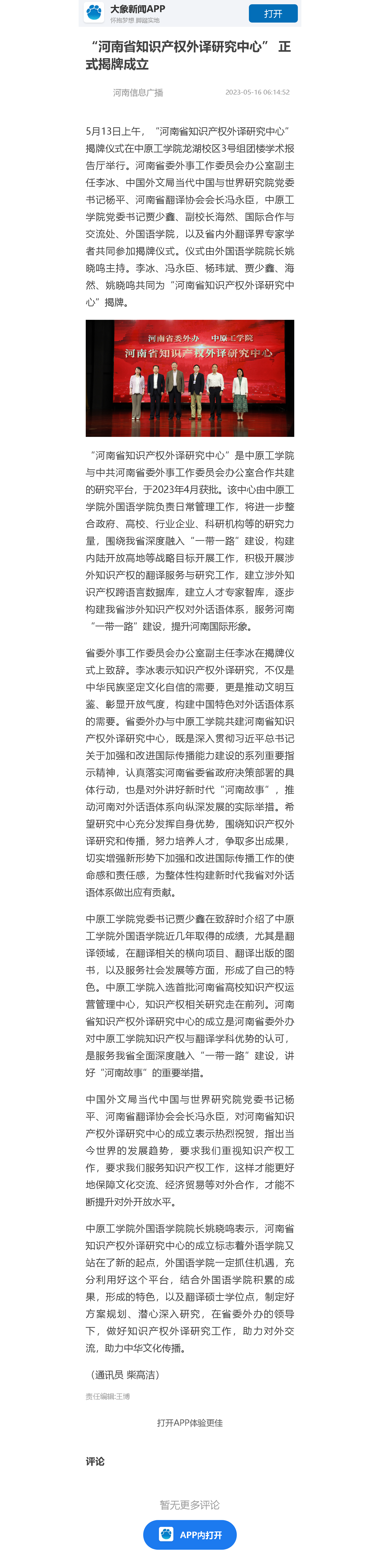 365在线体育投注官网经理姚晓鸣表示,河南省知识产权外译研究中心的成立标志着外语公司又站在了新的起点,365在线体育投注官网一定抓住机遇,充分利用好这个平台,结合365在线体育投注官网积累的成果,形成的特色,以及翻译硕士学位点,制定好方案规划、潜心深入研究,在省委外办的领导下,做好知识产权外译研究工作,助力对外交流,助力中华文化传播。