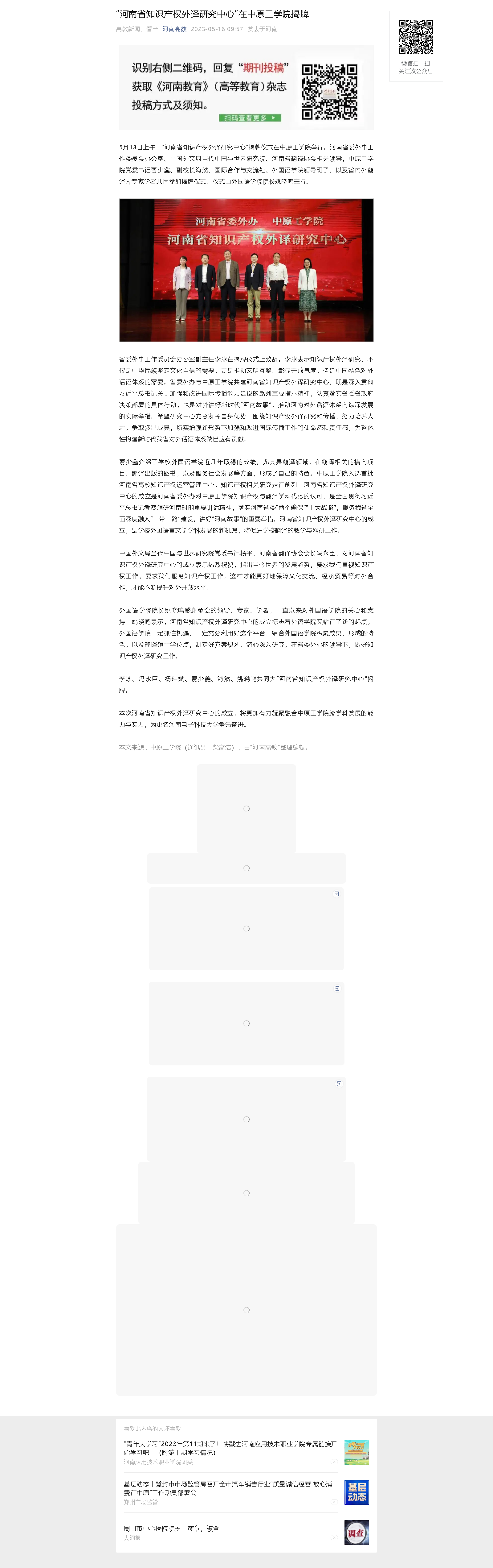 5月13日上午,“河南省知识产权外译研究中心”揭牌仪式在365在线体育投注官网举行。河南省委外事工作委员会办公室、中国外文局当代中国与世界研究院、河南省翻译协会相关领导,中原工公司党委书记贾少鑫、副董事长海然、国际合作与交流处、公司领导班子,以及省内外翻译界专家学者共同参加揭牌仪式。仪式由365在线体育投注官网经理姚晓鸣主持。