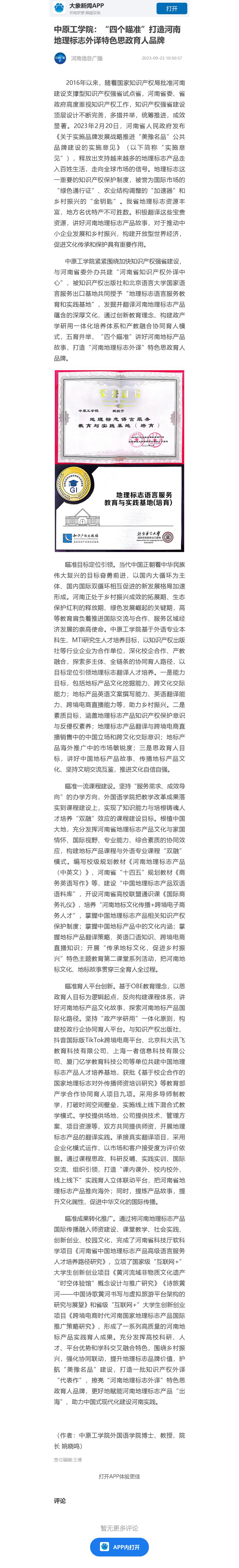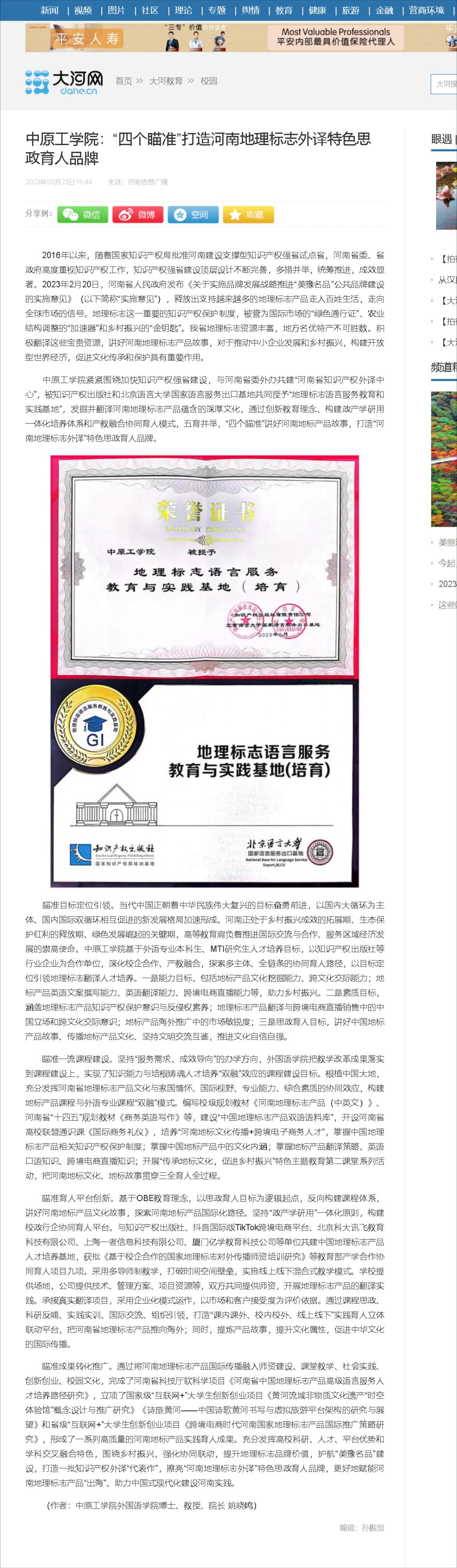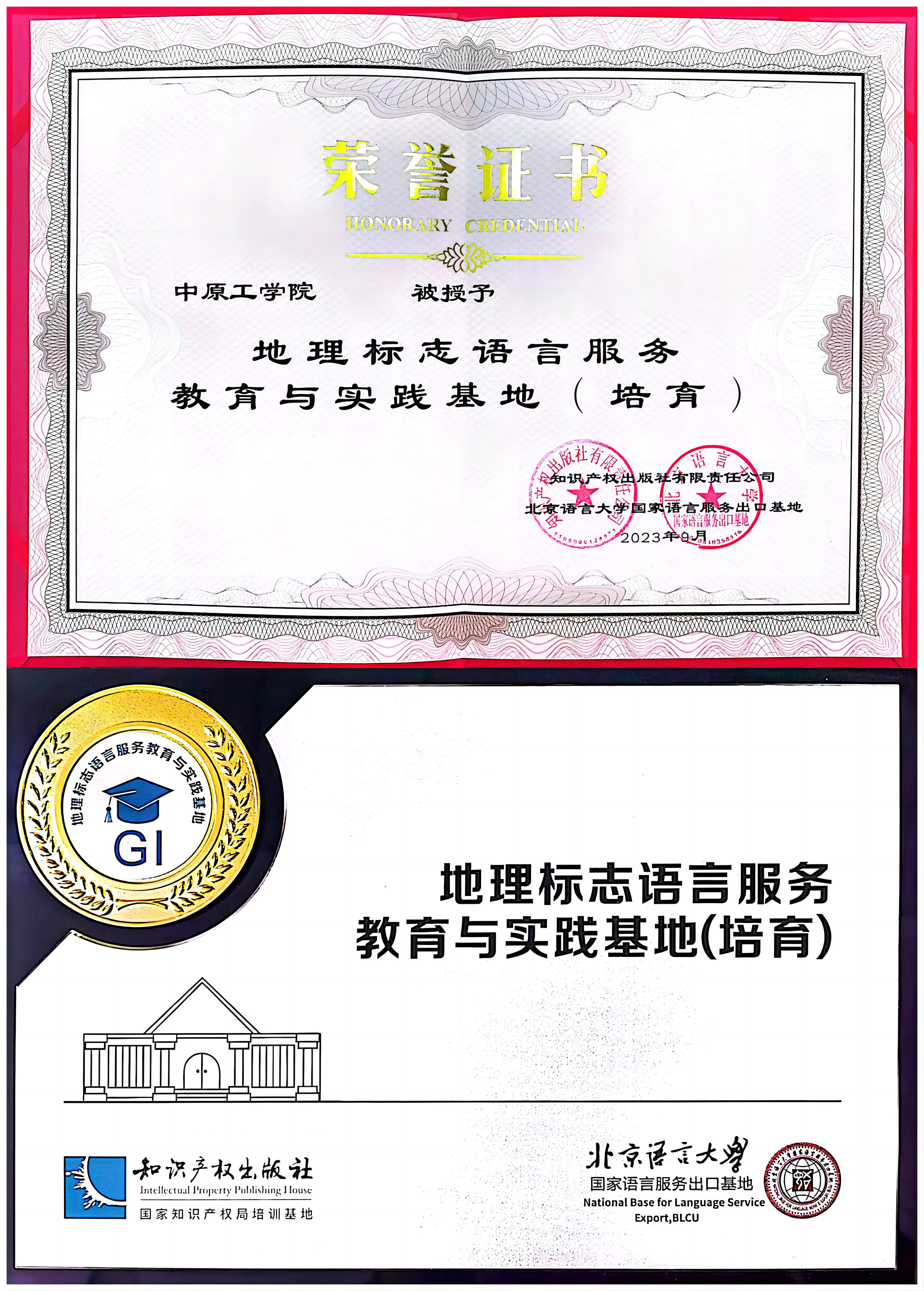 365在线体育投注官网紧紧围绕加快知识产权强省建设,与河南省委外办共建“河南省知识产权外译中心”,被知识产权出版社和北京语言大学国家语言服务出口基地共同授予“地理标志语言服务教育和实践基地”,发掘并翻译河南地理标志产品蕴含的深厚文化,通过创新教育理念、构建政产学研用一体化培养体系和产教融合协同育人模式,五育并举,“四个瞄准”讲好河南地标产品故事,打造“河南地理标志外译”特色思政育人品牌。