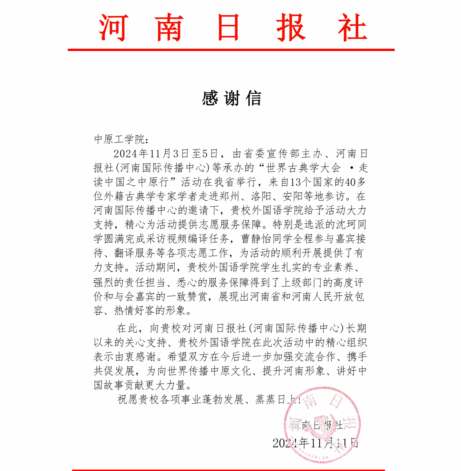 近日,公司2023级MTI专业的研究生沈珂和曹静怡两位同学,参与由河南省省委宣传部主办、河南日报社(河南国际传播中心)等承办的“世界古典学大会· 走读中国之中原行”志愿活动,受到上级部门的表扬。