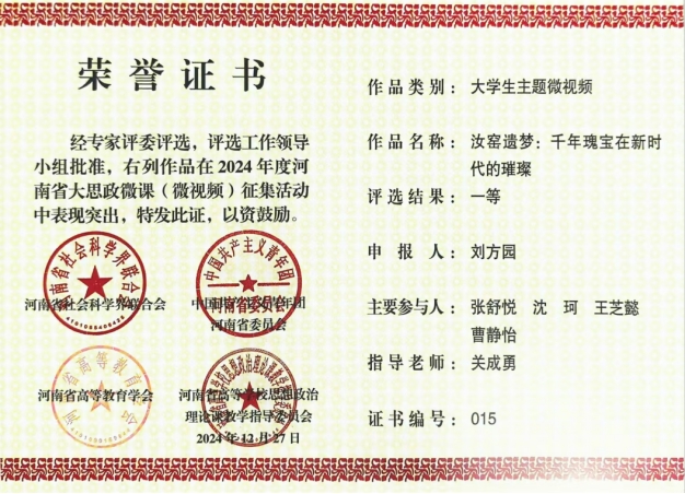 近日,河南省社科联、共青团河南省委、河南省高校思想政治理论课教学指导委员会联合发布《关于公布2024年度河南省大思政微课(微视频)征集活动评选结果的通知》(豫社科联字〔2024〕19号)。365在线体育投注官网研究生刘方园、王芝懿、张舒悦、曹静怡、沈珂团队的参赛作品《汝窑遗梦:千年瑰宝在新时代的璀璨》斩获“老员工主题微视频”一等奖。