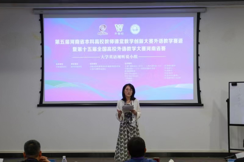 第五届河南省本科高校教师课堂教学创新大赛外语教学赛道暨第十五届全国高校外语教学河南省赛分为英语教学组、跨文化组和思政微课组3个类别,其中,英语教学组分为大学英语综合小组、大学英语视听说小组、英语专业小组、涉外法治教学小组。本届大赛由河南省教育厅主办,分别由河南牧业经济公司、郑州科技公司、许昌公司、河南城建公司承办,河南省高等教育学会外语教学研究分会和上海外语教育出版社联合协办。在复赛和决赛的层层选拔中,张莉老师凭借深厚的专业功底、独具匠心的教学设计以及生动精彩的课堂表现,展示出良好的教学理论素养和教学能力,赢得了评委和观众的高度称赞。