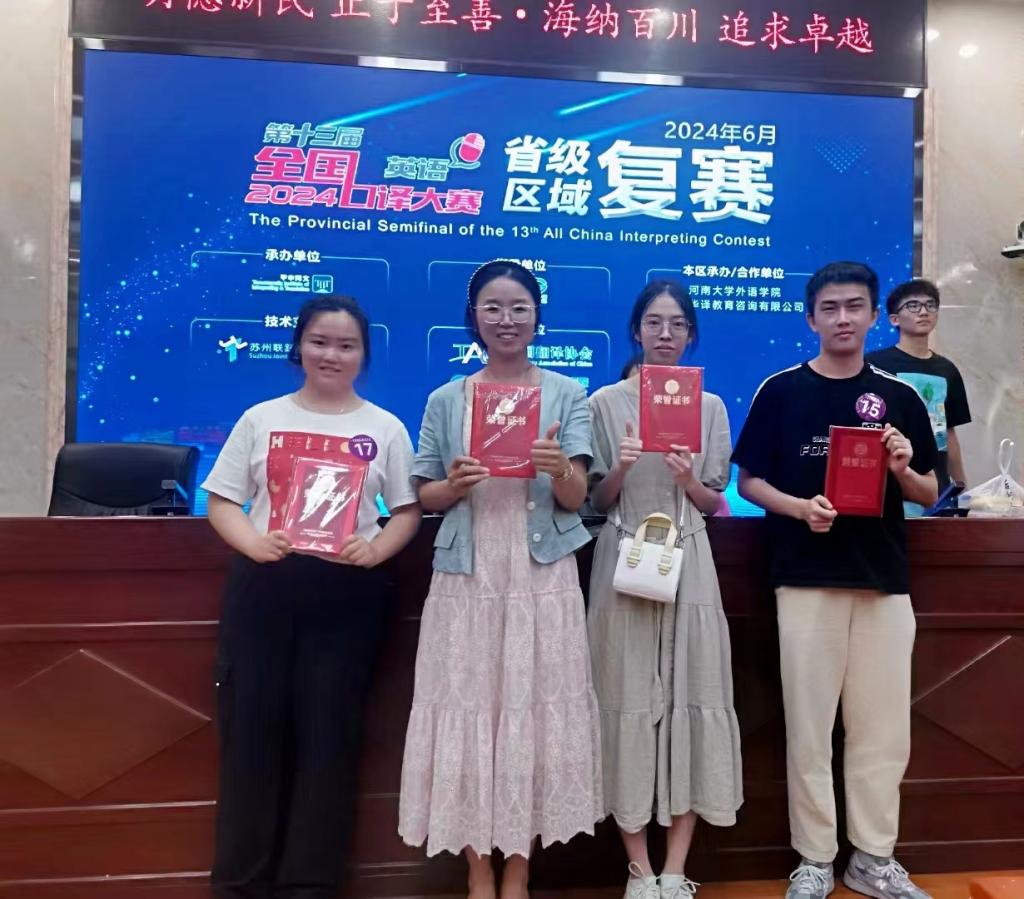 2024年6月26日,第十三届全国口译大赛河南省赛落下帷幕,公司MTI23级研究生沈珂和英语211班的刘俊颖同学均获河南省三等奖,英语211班的谢梦羽同学获河南省优秀奖。姚晓鸣、贺红艳两位老师荣获优秀口译指导教师奖。