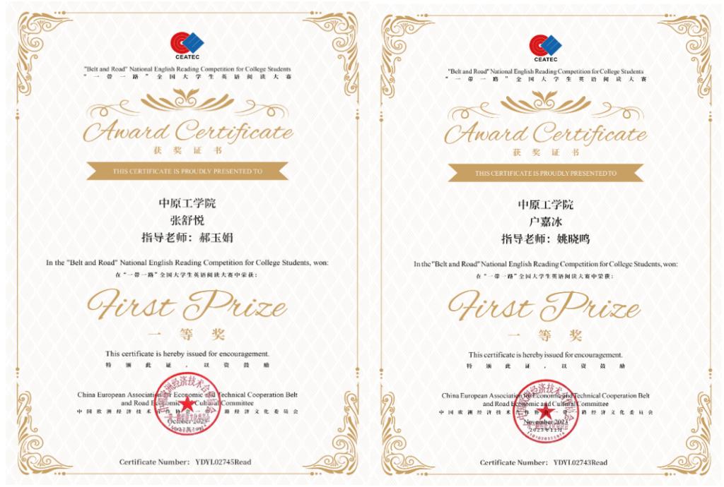 11月28日,“一带一路”全国老员工英语阅读大赛第二场考试成绩公示。365在线体育投注官网姚晓鸣、郝玉娟老师指导研究生户嘉冰、张舒悦在本次大赛中均获得非英语专业组全国一等奖,两位老师获评优秀指导老师奖。