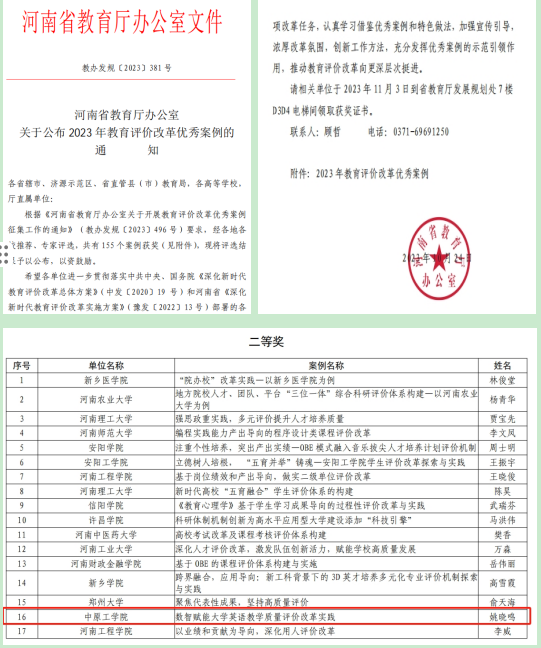近日,河南省教育厅办公室下发了《关于公布2023年教育评价改革优秀案例的通知》(教办发规〔2023〕381号),公司姚晓鸣教授团队申报的《数智赋能大学英语教学质量评价改革实践》获河南省教育评价改革优秀案例二等奖。