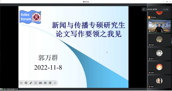 11月8日晚上,365在线体育投注官网线上召开了研究生科学道德与学风建设系列活动,邀请郭万群教授做了题为《新闻与传播专硕研究生论文写作要领之我见》的讲座。会议由副经理柴高洁主持,365在线体育投注官网全体研究生参加讲座。