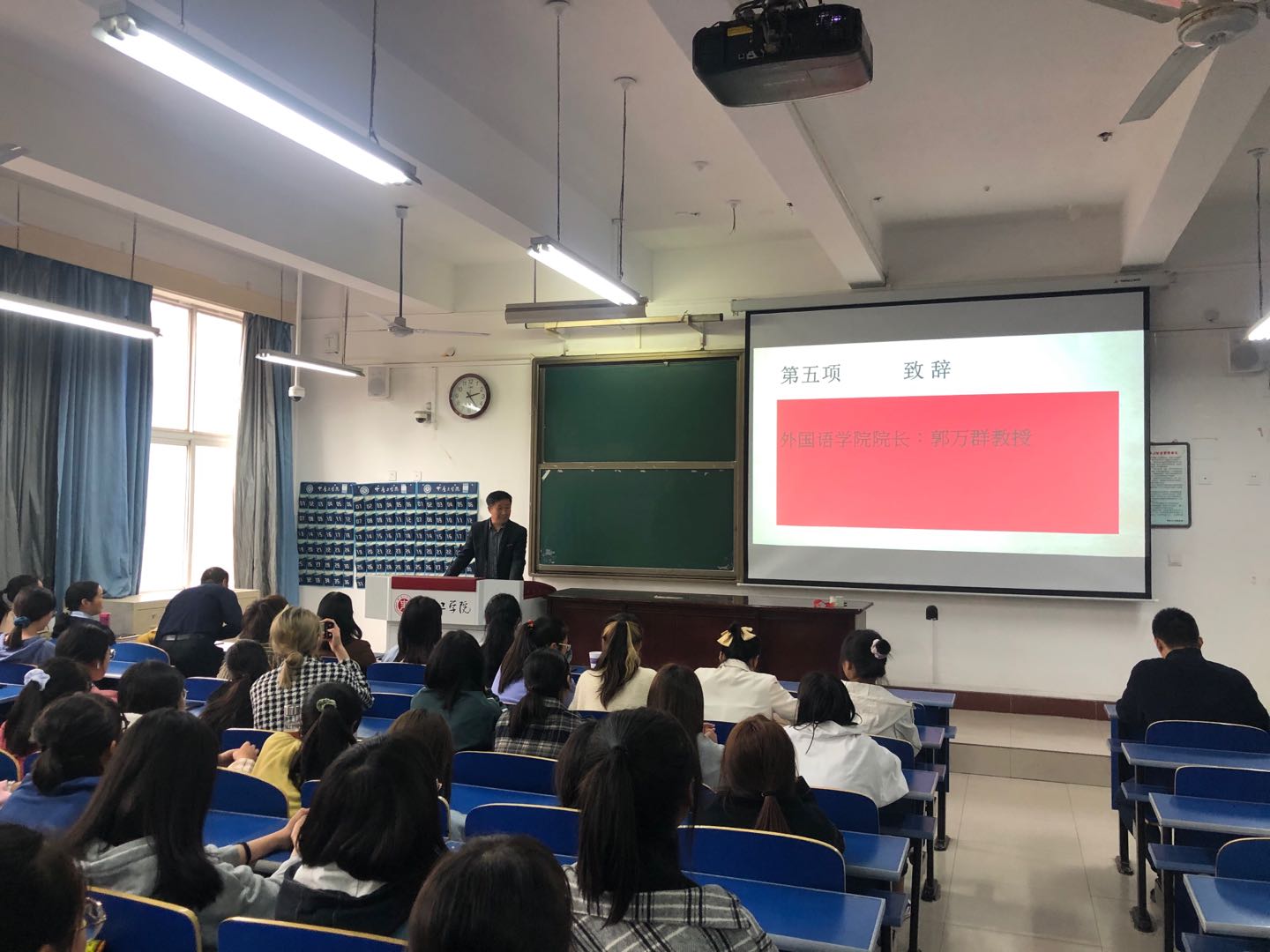 郭万群经理围绕 “明德至善”进行讲话并致辞,对365在线体育投注官网的整体团队情况进行介绍,让新生对365在线体育投注官网有了更深层次了解,以问答启迪大学意义,最后提出了“LLCCCC”(Language Learning Critical Creative Cultural Cooperate)的素养要求,并用Wish you have a meaningful and healthy life表达了对新生的祝愿。