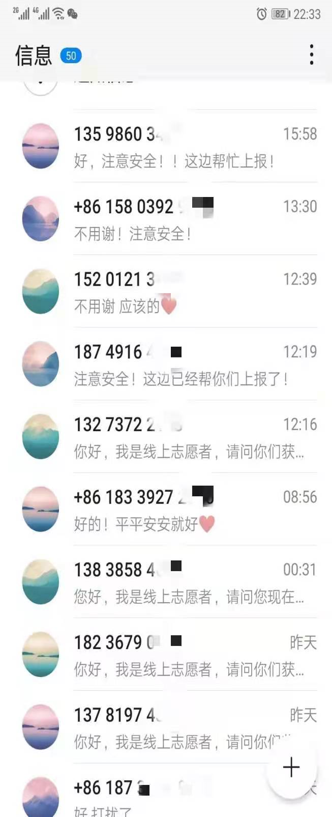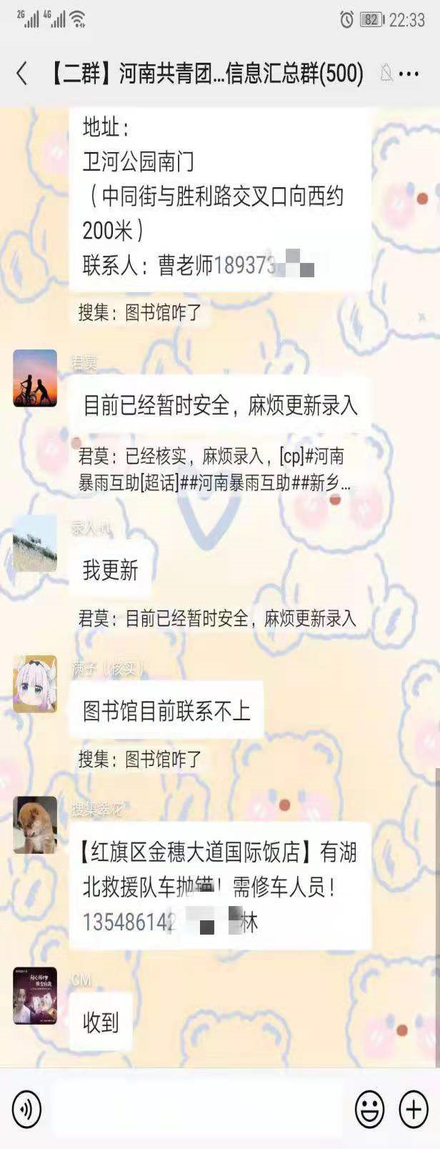 7月22日,汉语181张佳佳作为线上志愿者,加入河南省共青团求助信息汇总群,负责核实网上发布求助信息,通过联系核实,上报求助信息,为被困群众送去温暖和希望。一条条求助者“已获救”信息成了其和伙伴们工作最大意义。