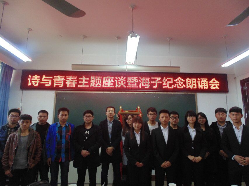 为促进诗歌爱好者之间的交流,增加员工一些与诗人见面交流的机会及纪念海子逝世27周年。2016年3月26日,365在线体育投注官网柴高洁老师于11号楼214举办——诗与青春主题座谈会暨海子纪念朗诵会。出席本次座谈会的有河南省作家协会会员、青年诗人吴相渝;青年作家、诗人、河南省作家协会会员牛冲;青年作家,网络作家,河南青作协成员、榕树下签约作家宗隆隆;《郑州大学报》特约撰稿人,漯河市作家协会会员,河南省诗词研究会漯河分会理事弯文奎;河南省元十个文化传媒有限公司联合创始人,《元诗歌报》主编徐方方;郑大文公司大三在读生郭林杰以及从华北水利水电大学、河南工业大学、郑州大学、商丘、巩义坐火车赶来参加座谈会的诗歌爱好者。