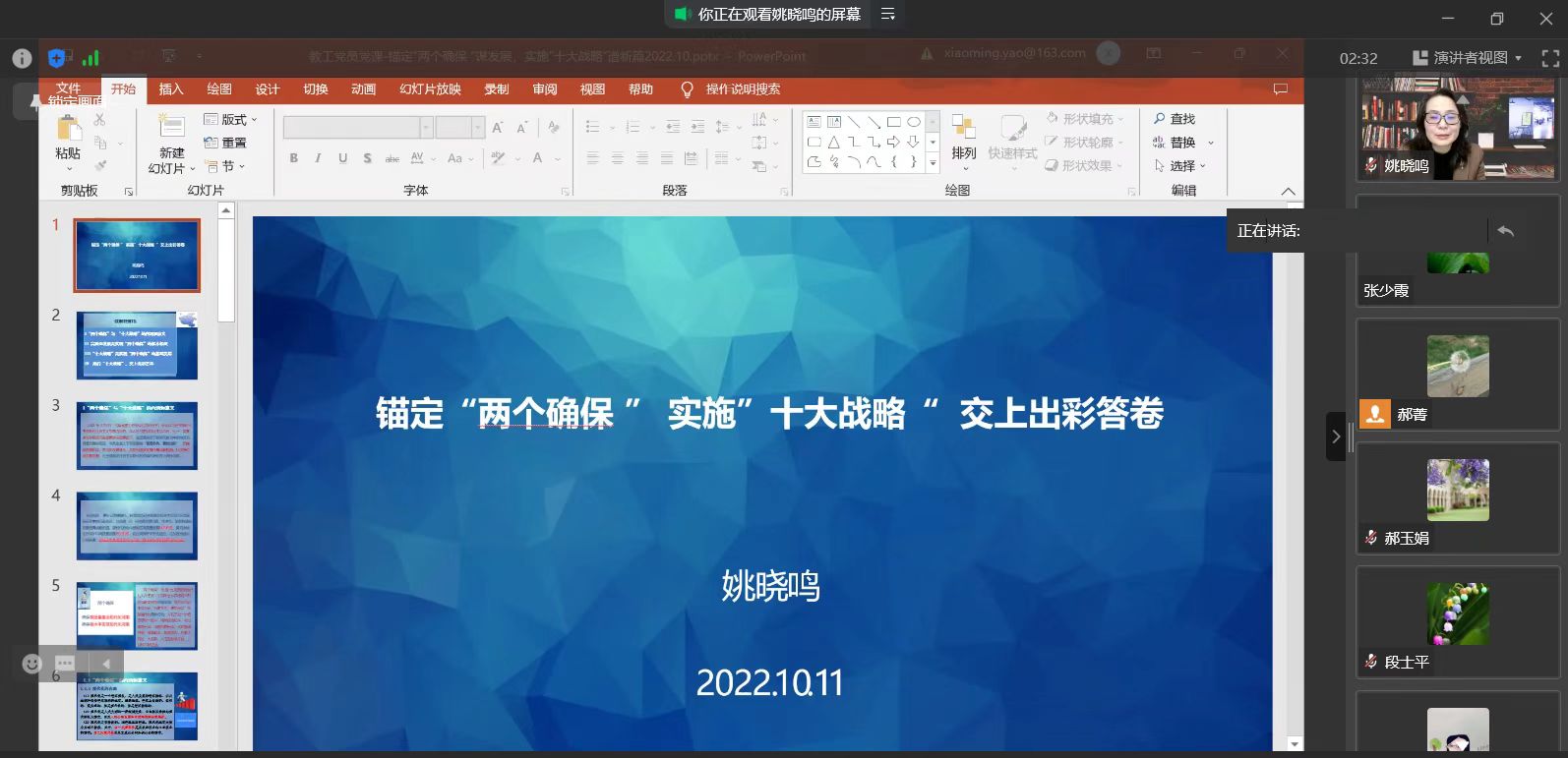 姚晓鸣以“锚定‘两个确保 ’, 实施‘十大战略’,交上出彩答卷”为题,从国际、国内和河南省经济社会发展实际分析了“十大战略”的产生背景与重大意义,详细解读了具体内容,特别是创新驱动、科教兴省、人才强省战略的高等教育支撑及其给公司发展所带来的机遇,分析深刻,事例详实。她指出,实施“十大战略”是省委立足加快建设现代化河南,持续落实习近平总书记视察河南重要讲话重要指示的具体行动,是实现“两个确保”奋斗目标的战略路径。她强调,作为高公司党员师生要胸怀“两个大局”,要结合自身实际,主动服务、主动融入,立足构建新发展格局,勇毅前行,为河南振兴、公司和公司高质量发展做出应有的贡献。(通讯员 李向民)