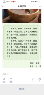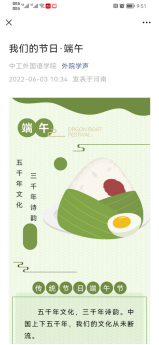 公司通过“外院学声”微信公号推送“我们的节日·端午”主题图文,宣传介绍端午节佩香囊、挂艾虎、赛龙舟等传统文化风俗,弘扬端午节所蕴含的深厚的爱国主义情怀和伟大的爱国主义精神。