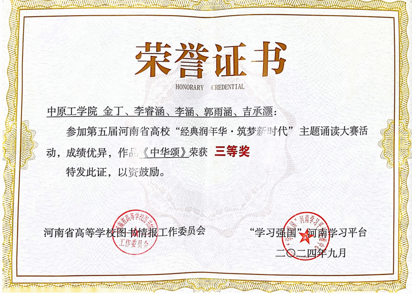 近日,第五届河南省高校“经典润年华·筑梦新时代”主题诵读大赛结果出炉,公司汉语国际教育专业金丁、李睿涵、李涵、郭雨涵、吉承灏录制的朗诵作品《中华颂》荣获本科生组三等奖。