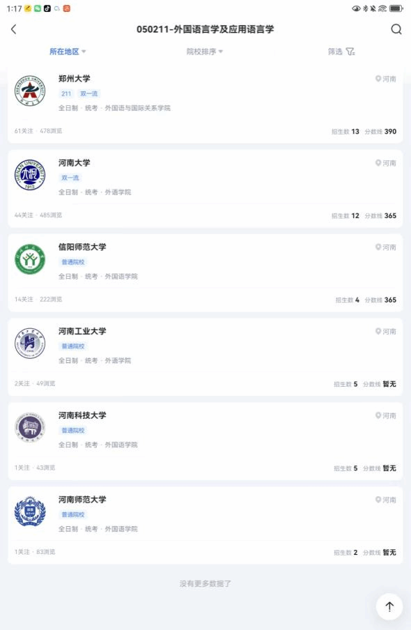 择校方面,我推荐同学们根据自己的实际情况和个人兴趣做决定,同时考虑将来的职业规划。全国开设英语类的研究生院校并不少,大家可以考虑自己想去的省份或者城市。一定要搞清楚这个公司是否歧视本科院校,自命题专业课是否存在大程度的压分现象,是否保护一志愿等信息。同时,大家可以借助粉笔考研APP,查取其中的院校库,专业库等等。这个软件中会告诉你详细的院校信息,参考书目,招考人数,录取分数线等等信息,比一个一个去官网搜简单快捷。以河南省份外应专业为例,如图所示: