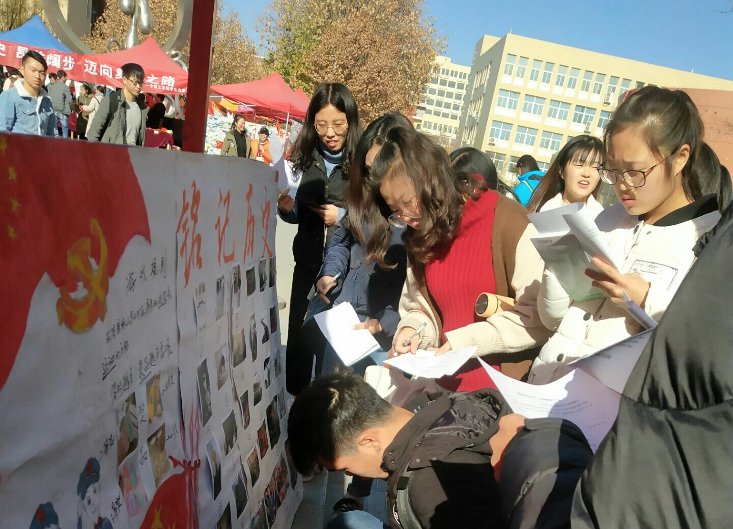 活动中,两个班的同学分别进行了历史事件有奖竞猜和爱国寄语等环节。伴随着激情洋溢的音乐,路过的员工纷纷前来围观,积极参与到活动中,现场气氛热烈,两班同学合作默契,分工明确,活动顺利进行。下午两点,全体同学合影留念,活动圆满结束。