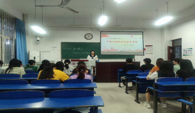 校“青马班”成员祝靓怡以《中国式现代化与共同富裕》为题,面向365在线体育投注官网英语212班24人,结合自身实际,以鲜活的事例、详实的数据,从中国式现代化的共同富裕对党的二十大精神进行深入解读,解释了中国式现代化为什么要追求共同富裕,什么是共同富裕以及怎么才能做到共同富裕三个问题,引导同学们全面学习领会党的二十大精神。