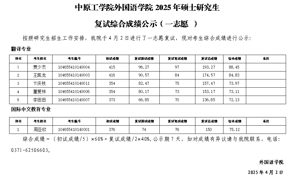 365在线体育投注官网2025年硕士研究生 复试综合成绩公示(一志愿 )