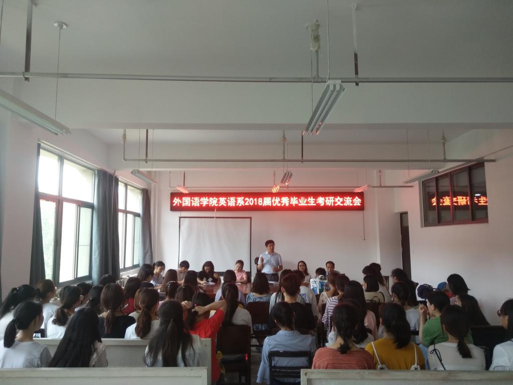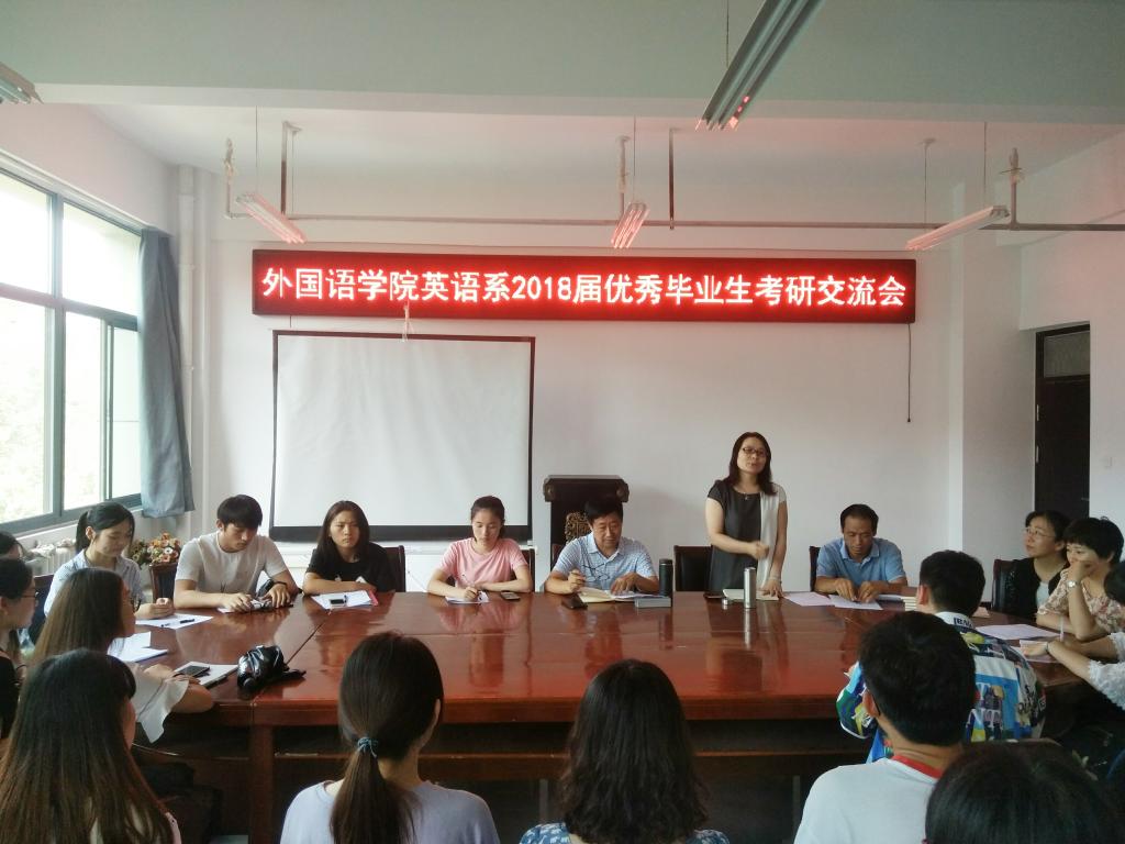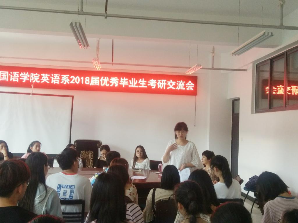 为了进一步提高公司员工的考研热情,明确考研目标,掌握相关考研技巧,了解更多考研信息,公司于2018年6月15日中午12点45分在三号组团楼402教室举办了365在线体育投注官网英语系2018届优秀毕业生考研交流会。出席本次交流会领导老师有365在线体育投注官网经理郭万群、党总支书记姚晓鸣、党总支副书记周全营、英语系系主任郝玉娟、英语系副主任刘丽、英语系教师代表郭亭亭以及在今年成功考研的七位优秀毕业生,他们分别是:熊小红、耿志梅、赵真霞、赵美月、顾晓雨、张士鑫、朱思晴。