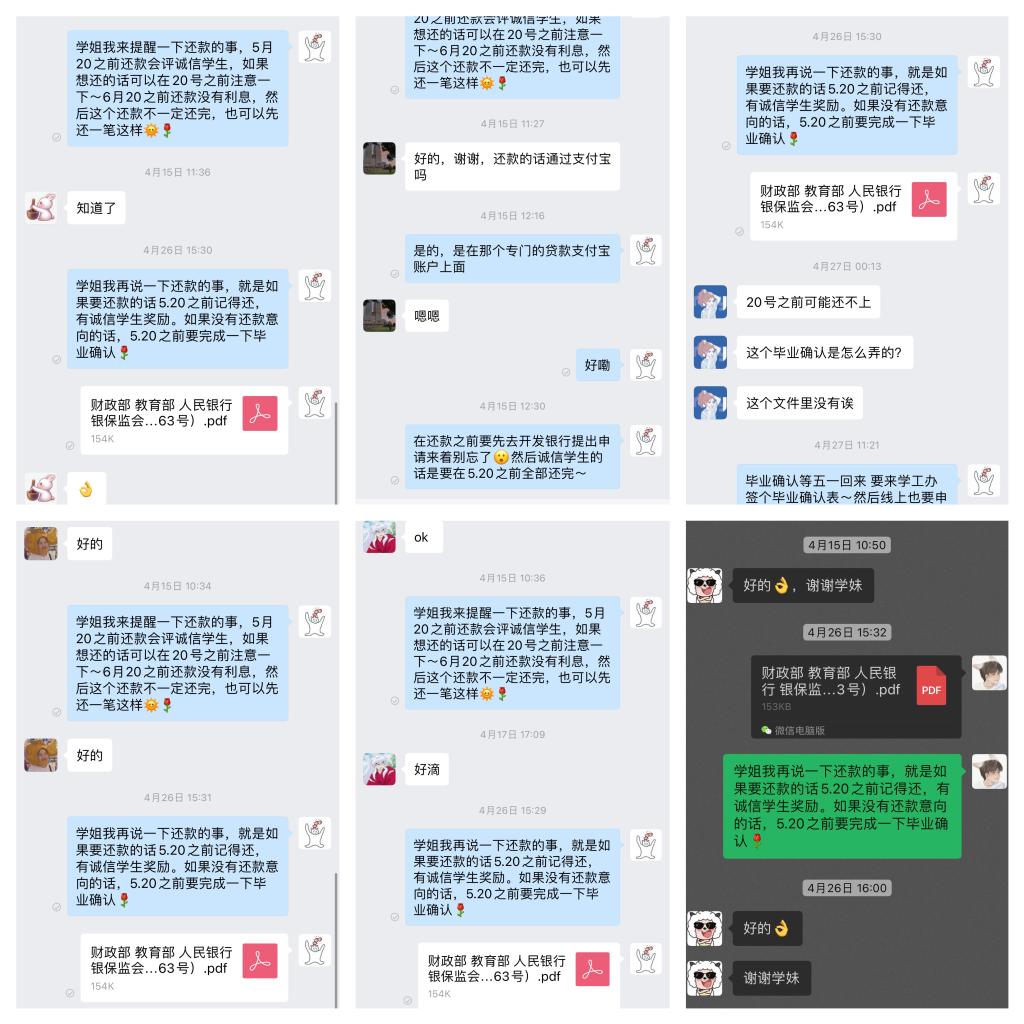 四月起,公司助学贷款工作小组便开始着手进行2024届毕业生高校贷款还款、征信等知识的宣传普及工作。工作小组成员积极行动,加强对员工贷款还本付息的宣传,指导,充分利用电话、微信、企业微信等软件,详细介绍了贷款在线服务系统的各项功能、支付宝还款流程与注意事项。鼓励有能力的毕业生积极还款,暂时不能还款的也督促其做好毕业确认(线上及线下),让员工明确还贷的操作流程和具体办法,为提高员工诚信意识,做好日常及日后联系工作打下了坚实基础。